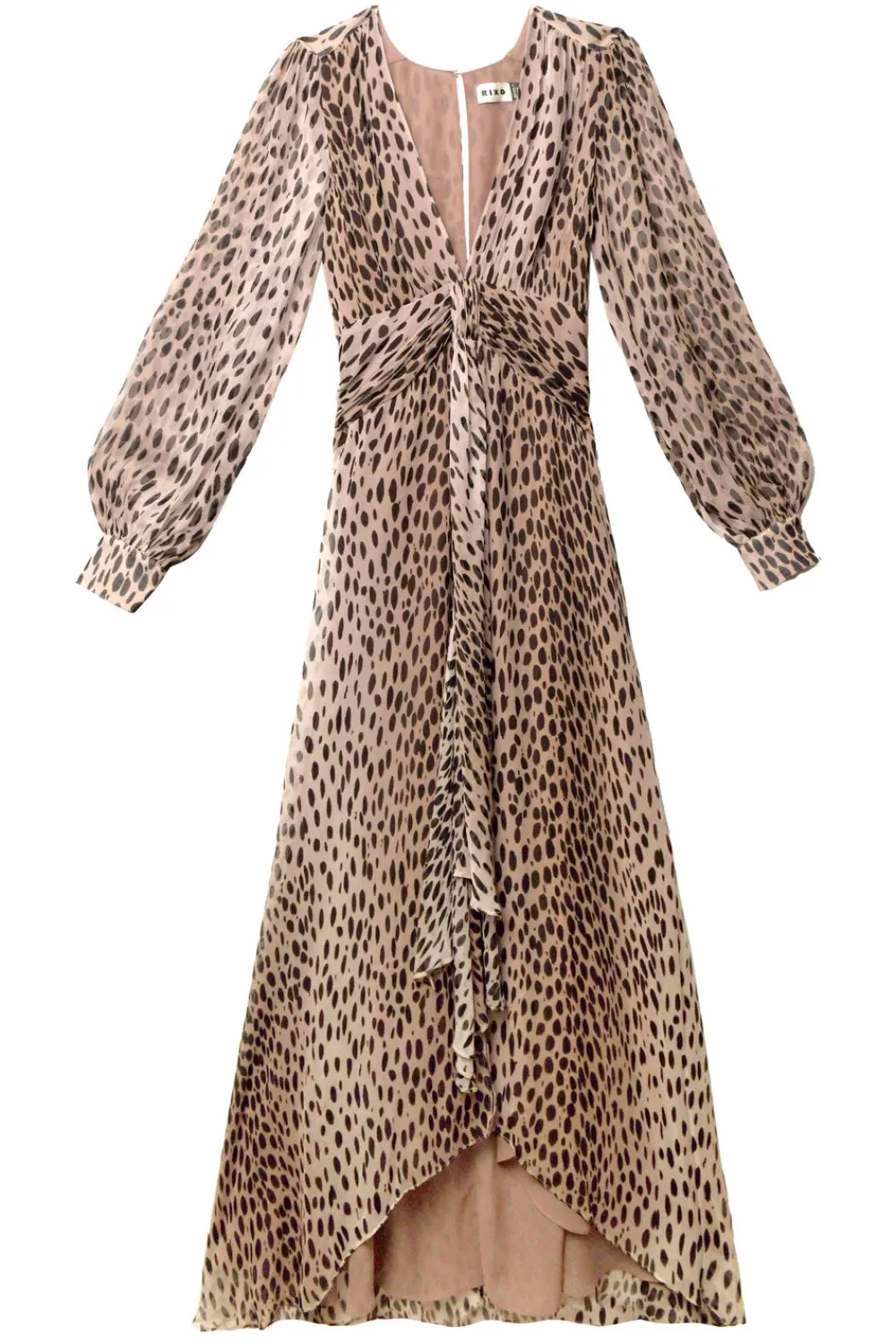 This Meera gown is an update on one of our bestsellers – the crinkled-chiffon feels extra special. Long sleeves balance the plunging neckline and the fabric is slit at the back to reveal a flash of skin.