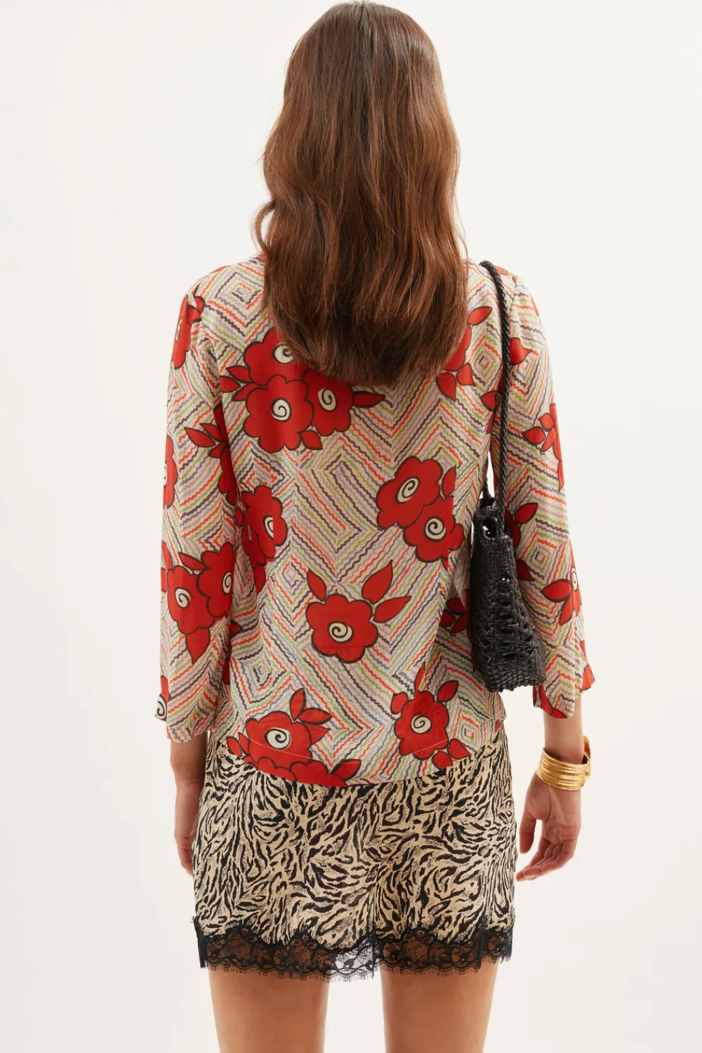 This Henny blouse is based on a vintage top from the seventies. We’ve mirrored the tie-front detail and neat collar and made it from our retro Milos Floral crepe de chine.