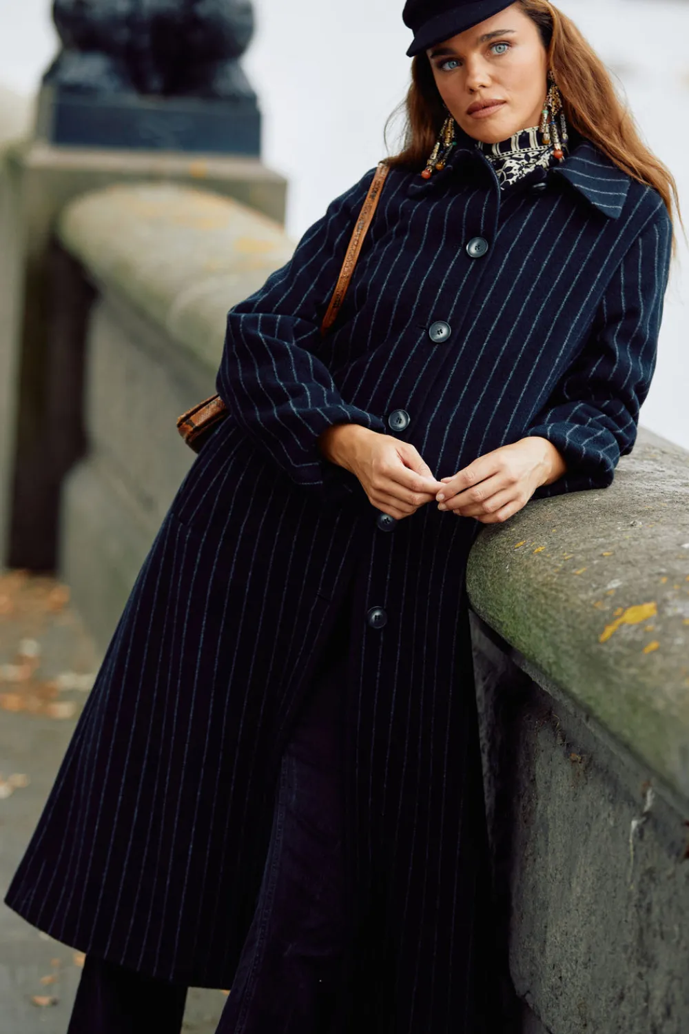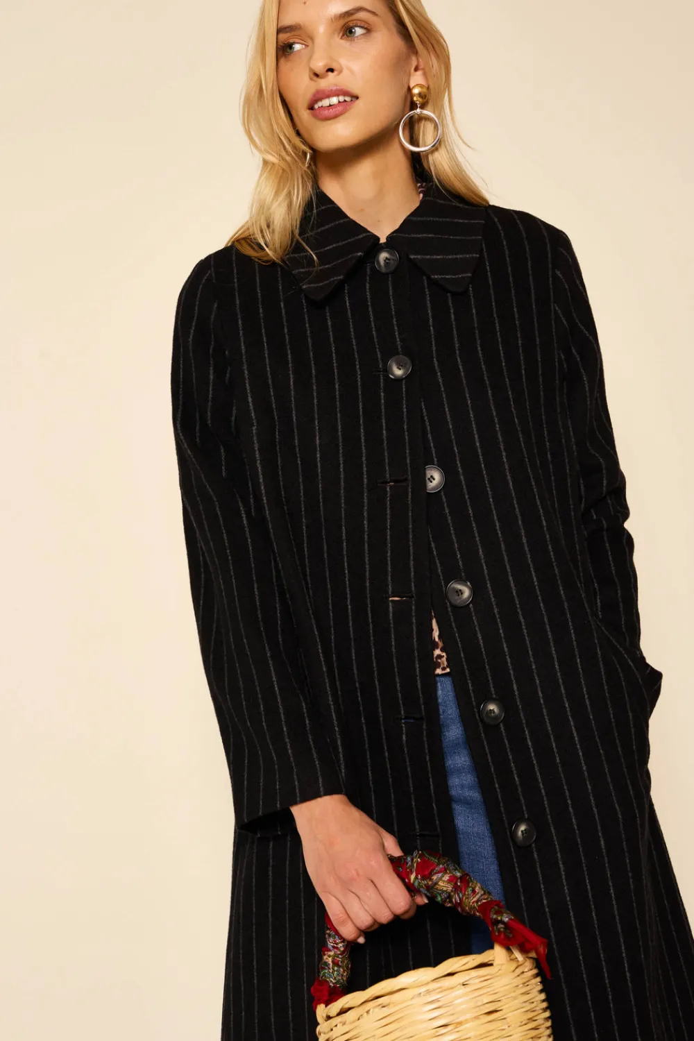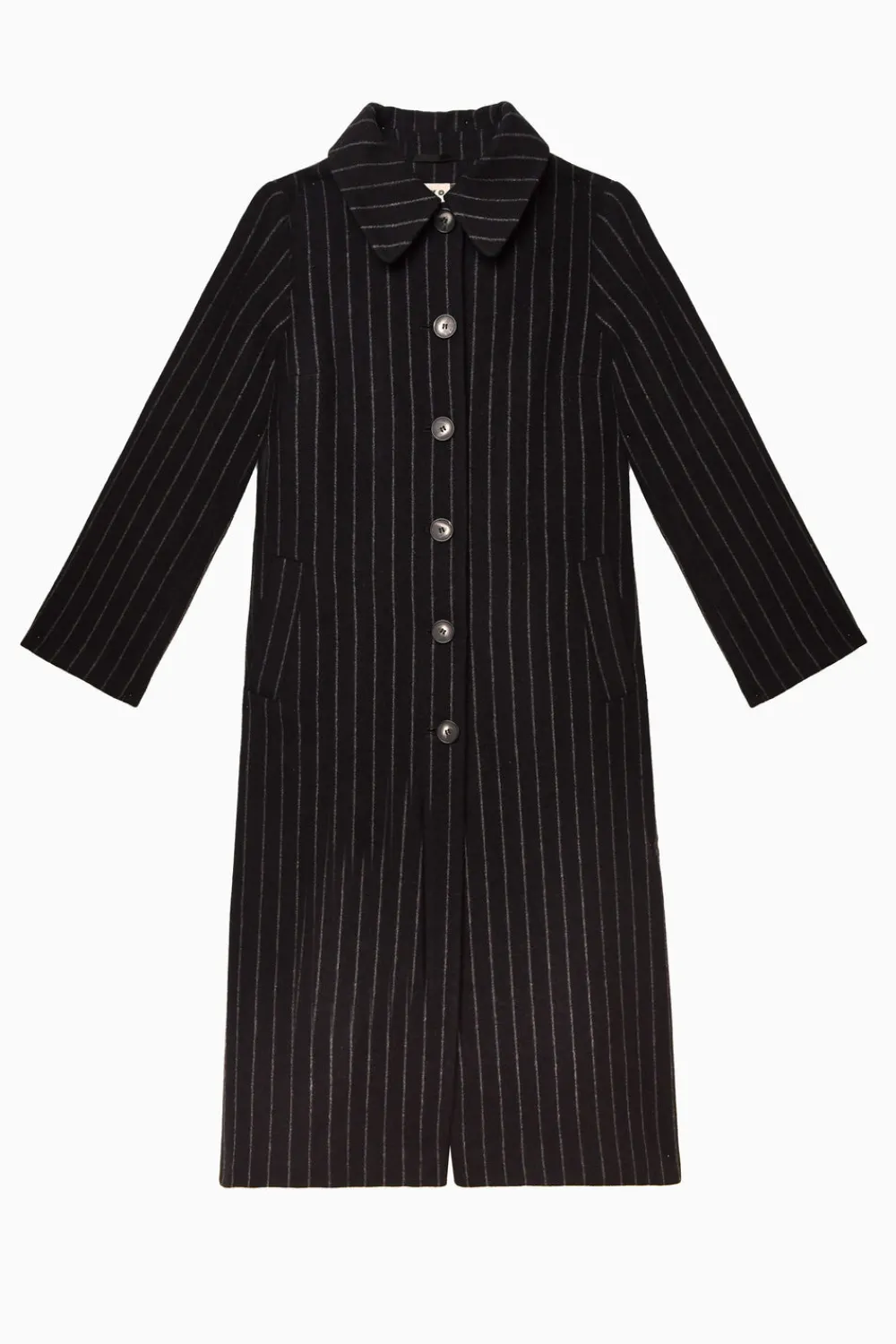 Our Milly coat is a RIXO signature, and we’ve updated the fabric and the fit to make it better than ever. Made from warm wool-blend, this black pinstriped version is a classic and really does go with everything.